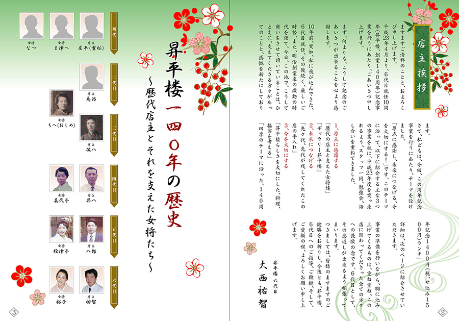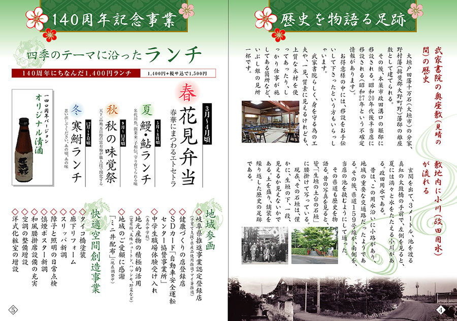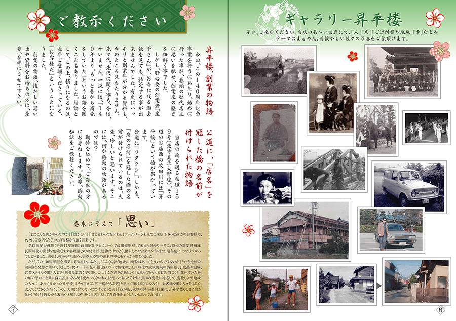 皆様にご支援、ご指導頂きながら、「地域に根差し、本巣市、真正、政田に昇平楼有り!」と皆様に愛される店創りを目指しています。